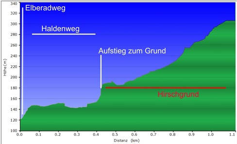 2. in entgegengesetzter Richtung (aufwärts) vom Elberadweg/Haldenweg zum Fremdenweg und